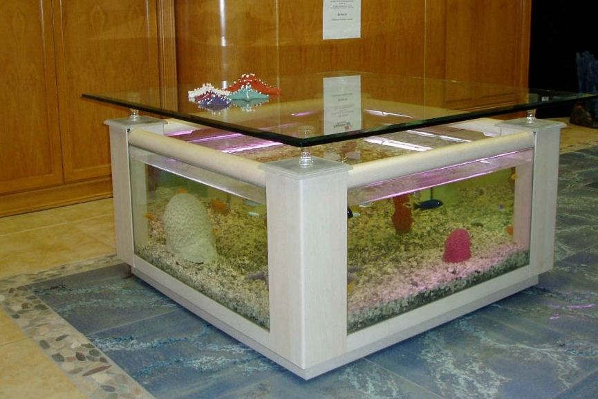 Um papel importante para tal aquário de mesa é desempenhado tanto pela forma geométrica do produto como pelo seu design interno. Dependendo do tamanho da sala de estar ou do armário, você pode comprar uma mesa de café redonda, oval ou retangular. Em hotéis ou escritórios, onde há mais espaço, será interessante olhar para o reservatório na forma de um balcão de recepção, e em um café você pode instalar um balcão de bar chique com um aquário embutido.