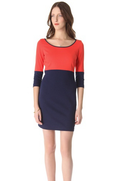 Vestido vermelho e azul também é ótimo para mulheres de qualquer idade. É importante observar uma regra: quanto mais escuro o azul, mais solene e rigorosa a roupa parece. Para as mulheres mais velhas, um vestido azul-vermelho é melhor escolher com um tom claro e frio de azul, tem um efeito rejuvenescedor.