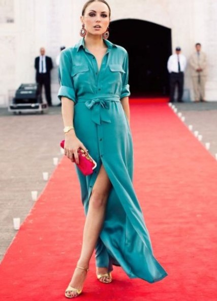 Se o seu modelo de vestido na forma de uma camisa tiver um maxi-length, é melhor escolher sapatos para ficar em modelos sem calcanhar. Nesta temporada, no verão, as sandálias gladiadoras serão relevantes, e no inverno - botas ásperas com acessórios de metal.