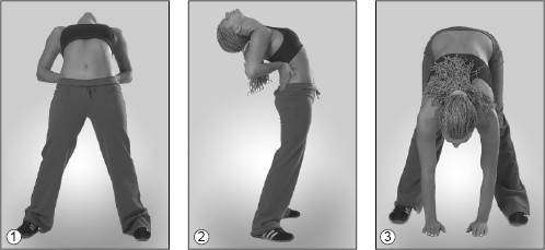 - segurando as mãos na parte inferior das costas, inclinando a cabeça para trás, em seguida, inclinando-se para frente, tocando as palmas das mãos do chão e fazendo alguns movimentos rápidos.