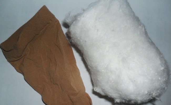 - Vamos começar criando uma cabeça de brownie. Para fazer isso, pegamos um capron nosochek ou herdeiro e o colocamos com algodão. Nódulos separados são colocados em lugares onde haverá bochechas e nariz, então costuramos. Com a ajuda de pontos simples, formamos o rosto - boca, nariz, rugas e sobrancelhas.