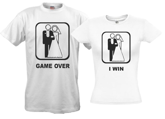 Para declarar ao mundo inteiro sobre seus sentimentos, sua alegria em relação ao casamento simplesmente - você só precisa comprar camisetas para os recém-casados. Seus assuntos podem ser diversos, eles podem ser decorados com tais inscrições: